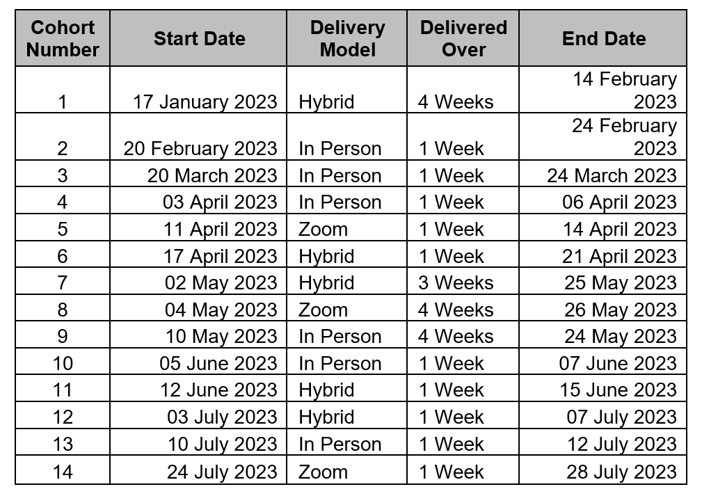 The course start days and timelines are listed below: