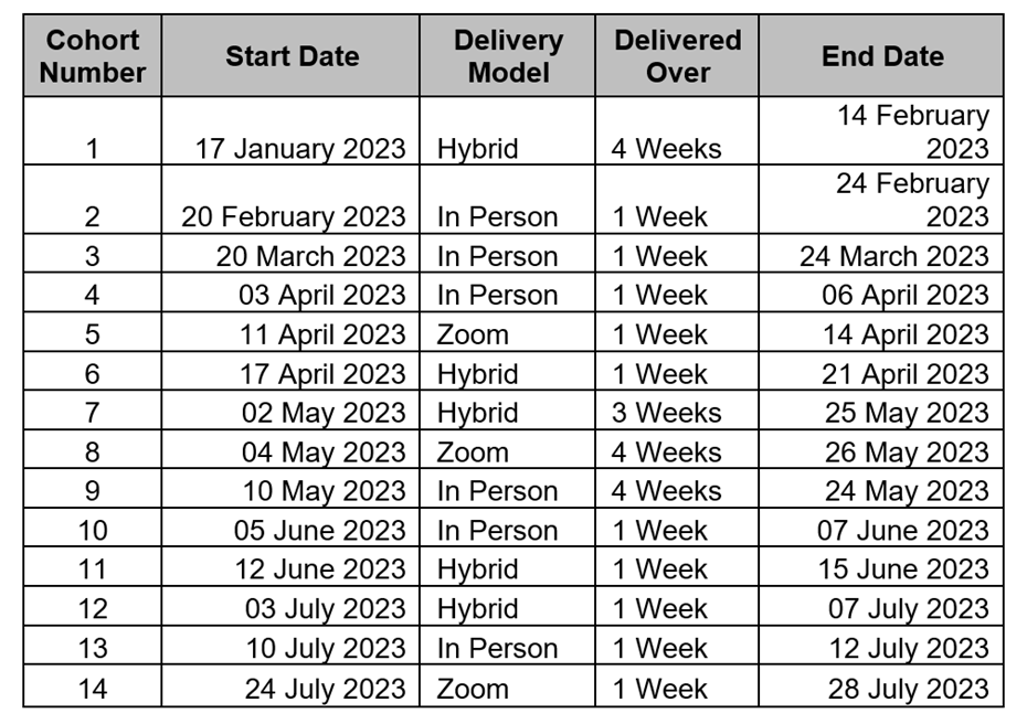 The course start days and timelines are listed below: